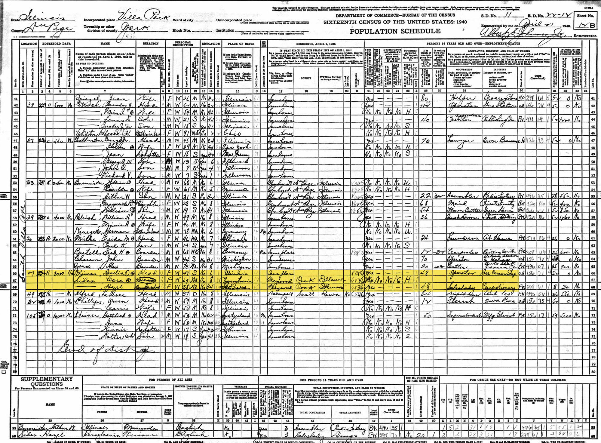 On 21 April 1940, Millie is enumerated as Amelia O Primas, head of household at 47 S Villa Avenue, Villa Park in DuPage County, Illinois. She is listed as 49 years old, single with a 6th grade education. She is the operator of an ice cream shop. It also indicates she was living in the same place (Villa Park) in 1935, but not same house. At the same address and in the same household, there is Cora Sides, 69 year old widow and her daughter-in-law, Hazel Sides, age 38 years, also a widow. Hazel is listed as a saleslady in a drug store confectionary department. Both Sides ladies are recorded as living in Maywood in 1935.
