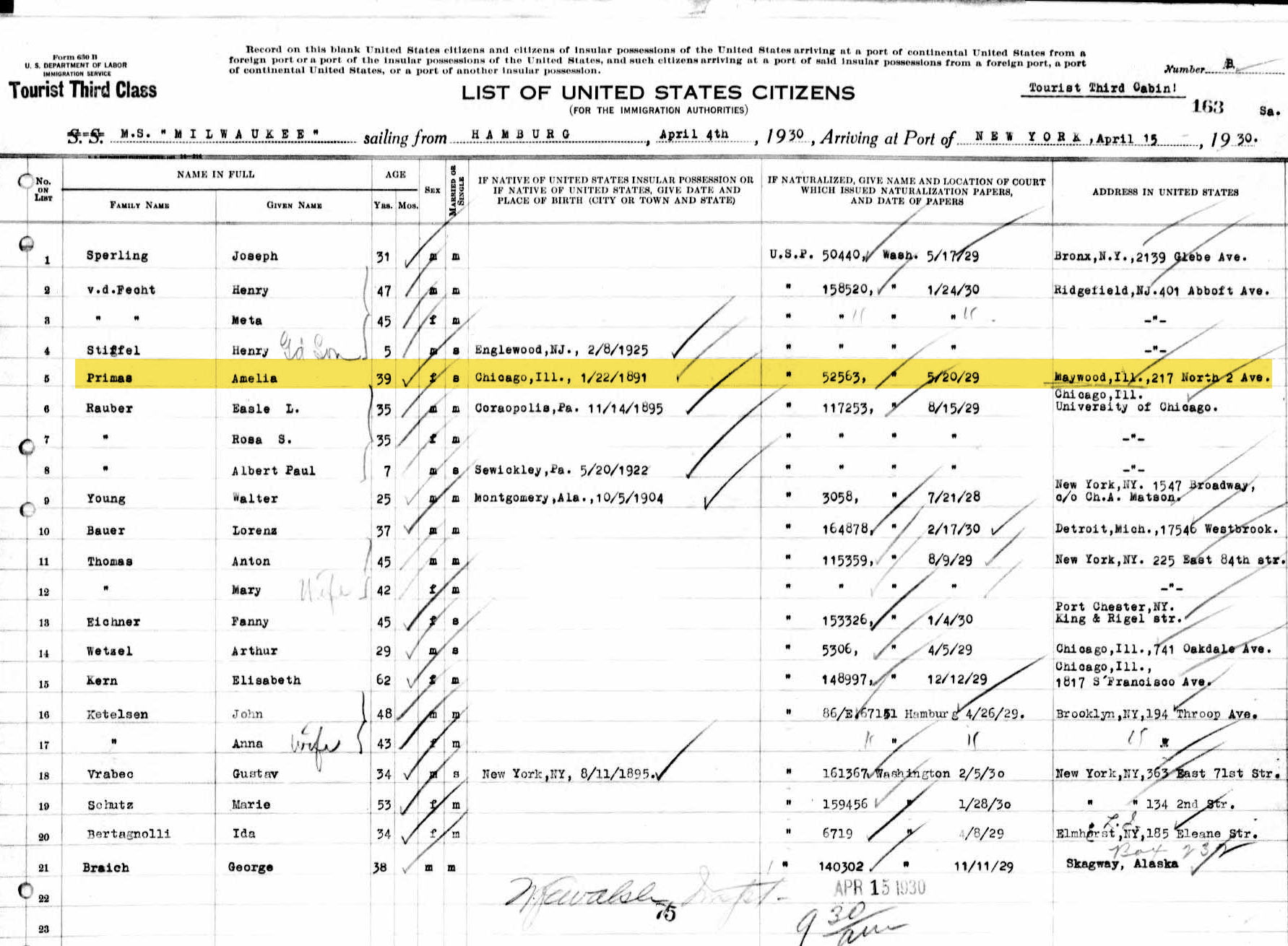 Two interesting items concerning this census document: Otto would marry Marie Piel in 1931 and Millie was arriving on the ship MS Milwaukee in New York on 15 April 1930, having departed from Hamburg Germany on 4 April 1930. Family recollections indicate that she had gone to visit family in the Posen area of Germany (formerly Prussia) where her parents had been born. Stories also suggest she had traveled there around 1919 with her mother as well, but I have no documentation for that.