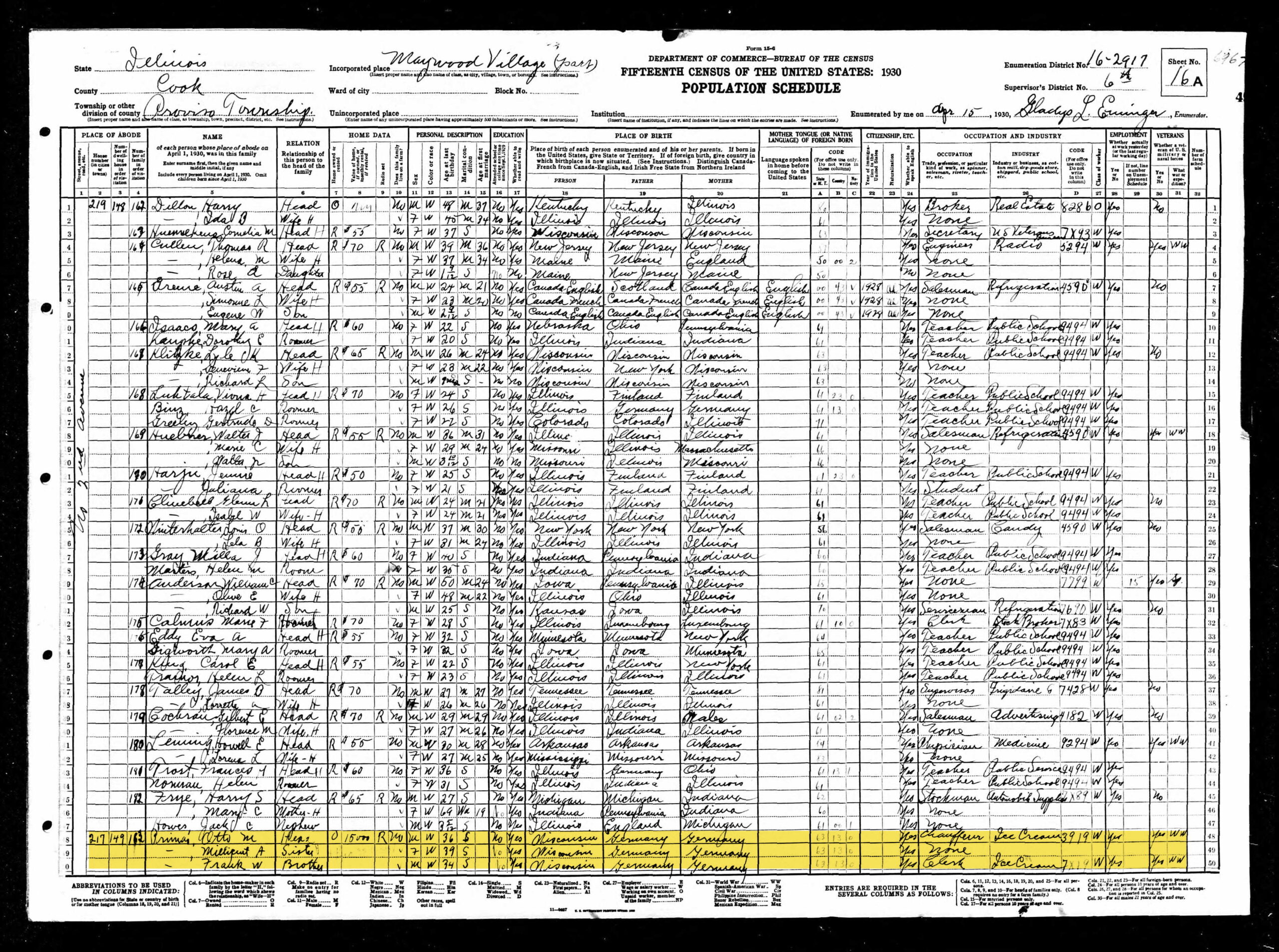 In the US Census dated 15 April 1930 for Proviso Township, Maywood Village in Cook County Illinois, Millie is enumerated as Millicent A. Primas, age 39, single, sister to the head of household and nothing listed for occupation. The head of the household is her brother Otto M., age 36, single, a chauffeur (driver) for an ice cream company. It also indicates that the house is owned with a value of $15,000. Others in the household are: Frank W [Waldemar], age 34, single, brother to head of household, and a clerk for an ice cream company; Louise J. Piel, roomer, age 69, widow and her daughter Marie, age 24 years, single, working as a bookkeeper for a wholesale druggist. They live at 217 N. Second Ave in Maywood.
