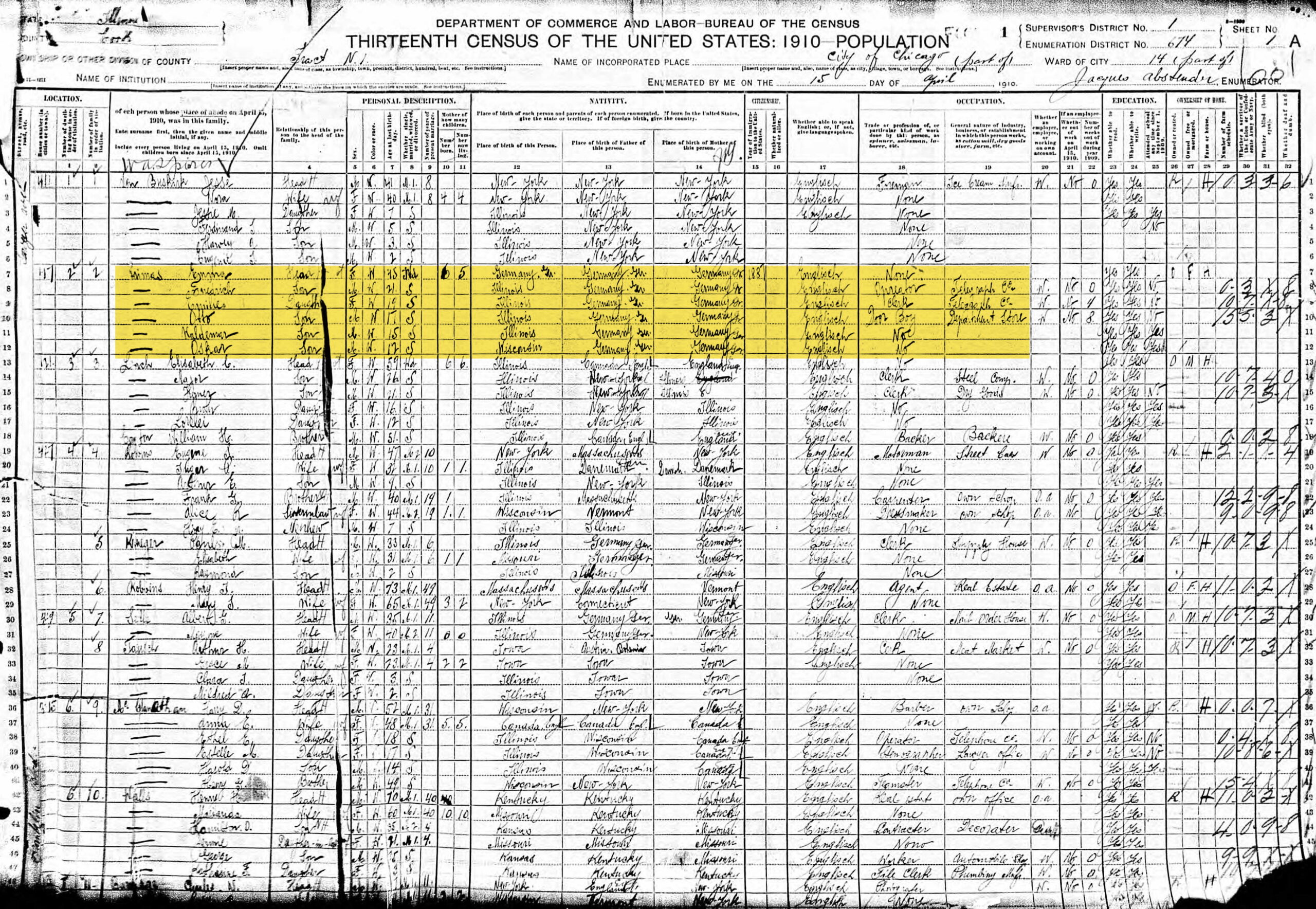 On 15 April 1910 in the US Census for Chicago, Cook County, Illinois, Millie is listed as Emilie, age 19, single, working as a clerk for a telegraph company. The head of the household is her mother Emma, age 45, widowed along with the other children: Friedrich, age 21, operator at a telegraph company; Otto, age 17, a door boy at a department store; Waldemar, age 15 and Oskar, age 12. They are living at 417 N Sawyer in Chicago.