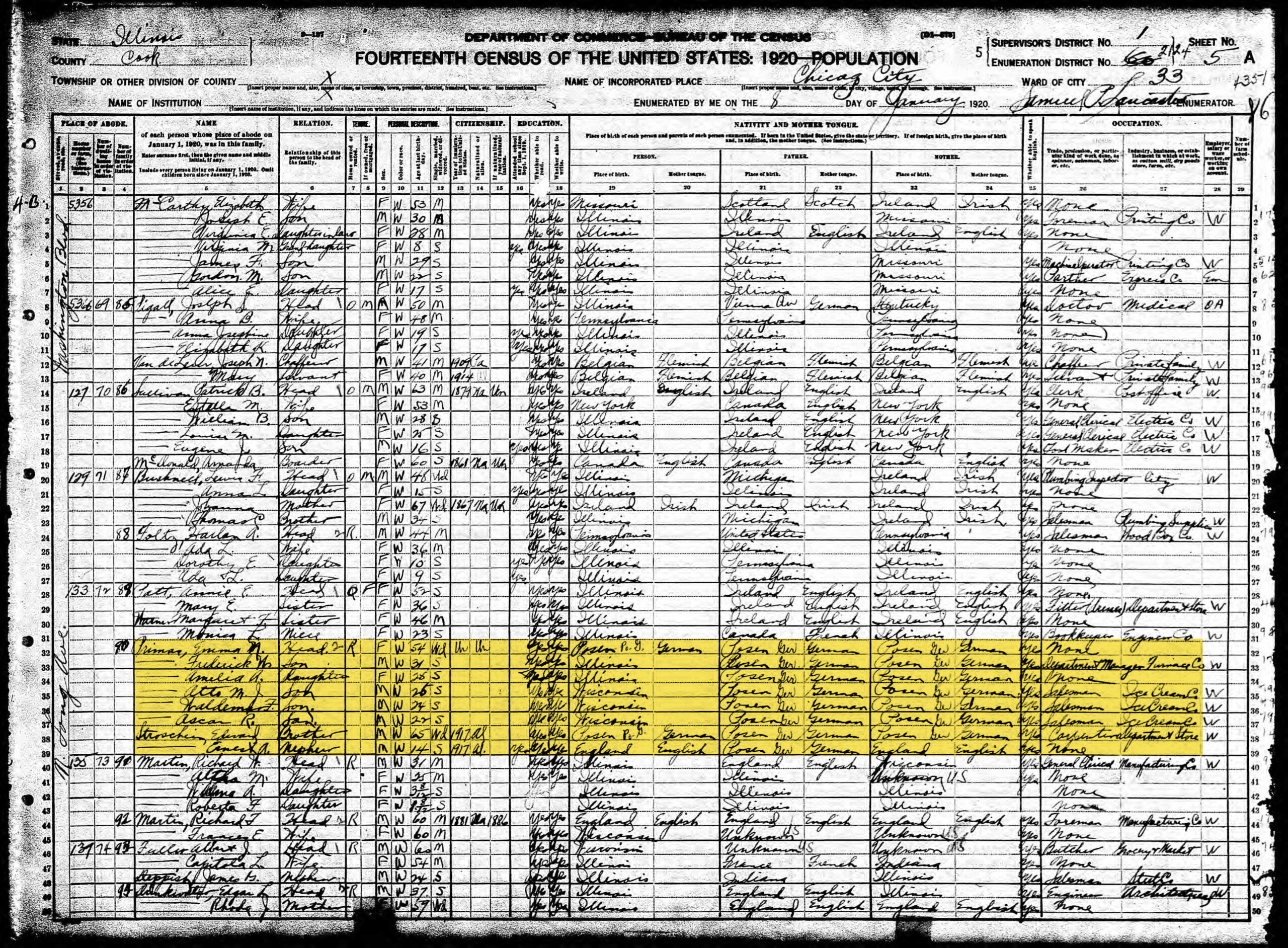It took me a while to find the family in the 1910 US Census because the indexer interpreted the name as Thomas, not Primas. I was able to find the family in the 1910 Chicago City Directory so I knew they should be in Chicago. I used the address from the Directory to find the Enumeration District using Stephen Morse's One Step process (http://www.stevemorse.org/census/unified.html). Then I had to page through the Census to find the family. When I found them, I saw the name as Primas easily, but then that is my name too!