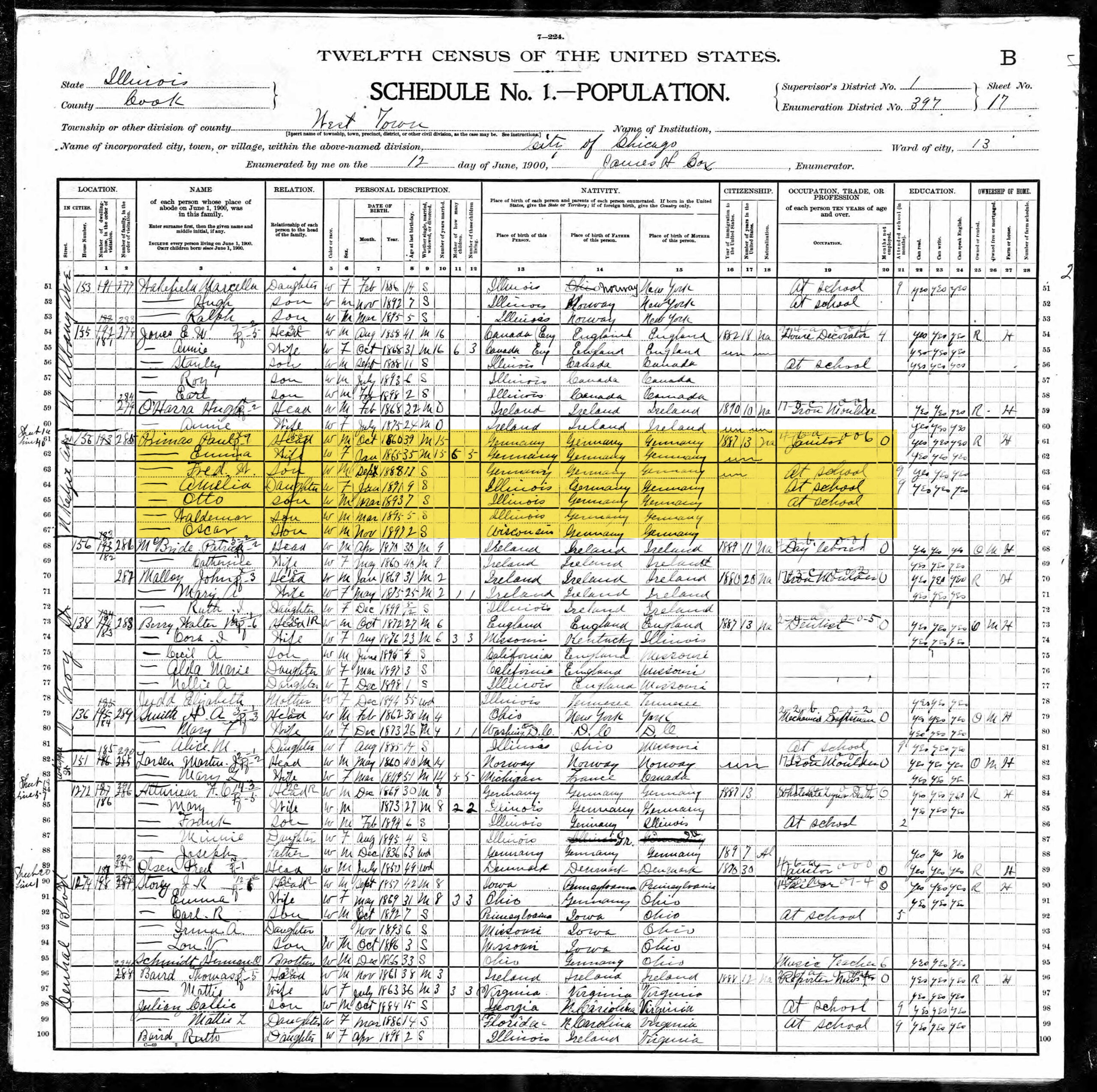 By the time of the 1900 US Census, the family is back in Chicago. Millie is enumerated on 12 Jun 1900 as Amelia, 9 years old with birth as Jan 1891 in Illinois. She is in the household of her father Paul Primas (occupation = janitor) along with her mother Emma, and brothers Fred W, age 11, Otto, age 7, Waldemar, age 5 and Oscar, age 2. They are living at 156 N Kedzie Avenue in Chicago. The census shows that her parents have been married for 15 years, and immigrated in 1887.